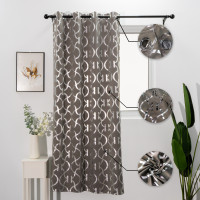- Sleek silver-patterned blackout curtains in neutral tones, offering customizable sizes