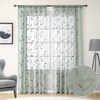 Green Sheer Embroidered Drapes | Leaf Pattern Faux Linen Sheer Curtains | Drapes for Bedroom Living Room